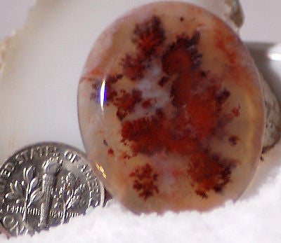 This is a beautiful Carey Plume Agate oval cabochon with fantastic plumes weighing 32.5 carats and measuring ~31 mm x 21 mm and 6 mm thick. Carey red plumes with darker tips and great agate.