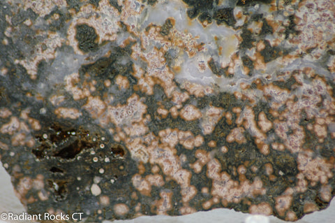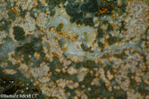 Madagascar Ocean Jasper 12.2 ounce (340 grams)Lapidary Cabochon slab measuring ~8" x 5" x 1/4".    Green, White, Orange with some brown pitting, some druzy pockets and nice white agate patches.
