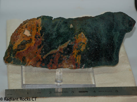Madagascar Ocean Jasper 6.2 oz (175 grams) Lapidary Cabochon slab measuring 5" x 2.25" x 3/8". Pink Spot and Red Gold spots on Green.