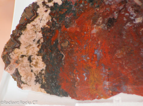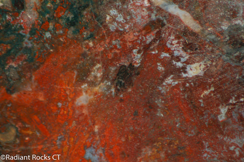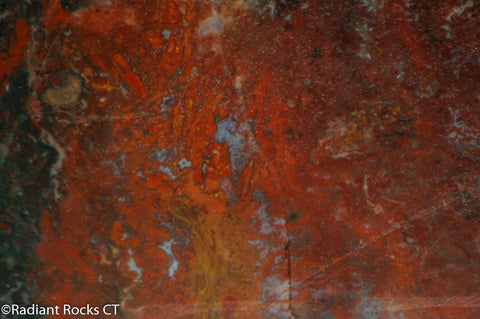 This is a 19.4 oz (550 grams)slab of Moroccan Jasper Agate measuring ~7.5" x 4.5" x 10/16". Green, Bright Red Orange, White, Brown, Yellow, and Salmon. This piece has some cracks and pits but there are a lot of great areas to cut some great cabochons.
